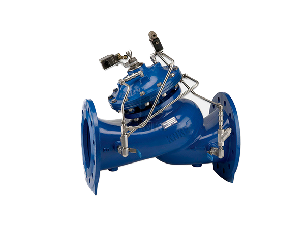 当阀门从进口端给水时,水流过针阀进入主阀控制室,出口压力通过导管作用到导阀上。当出口压力高于导阀弹簧设定值时,导阀关闭。控制室停止排水,此时主阀控制室内压力升高并关闭主阀,出口压力不再升高。当阀门出口压力降到导阀弹簧设定压力时,导阀开启,控制室向下游排水。由于导阀系统排水量大于针阀的进水量,主阀控制室压力下降。进口压力使主阀开启。在稳定状态下,控制室进水、排水相同,主阀开度不变,出口压力稳定。调节导阀弹簧即可设定出口压力。