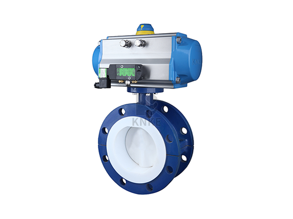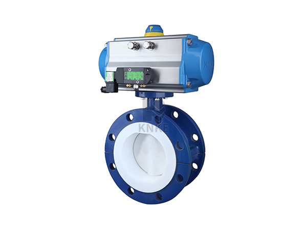 气动衬氟法兰蝶阀,Pneumatic fluorine lined flange butterfly valve,由188彩票KNKE气动执行器和衬四氟蝶阀组成。四氟蝶阀是为了适应一些具有强酸、强碱的腐蚀性环境,石油、化工、食品等多个特殊领域的需要,使用聚四氟乙烯制成的阀体,具有很强的防腐效果。在常规条件下可以替代不锈钢阀体,具有更高的性价比。 气动法兰衬氟蝶阀是用随阀柑转动的圆形蝶板做启闭性,以实现启用动作的气动阀门主要做截断阀使用,亦可设计成具有调节或段阀兼调节的功能,气动法兰衬氟蝶阀在低压大中口径管道上的使用越来越多。