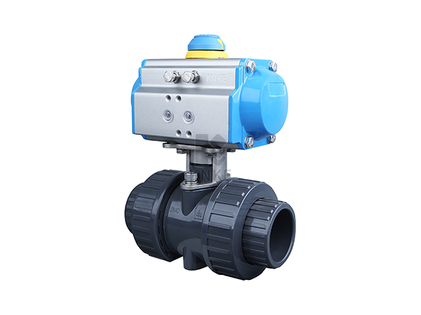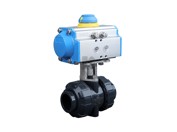 气动塑料球阀,Pneumatic plastic ball valve,由188彩票KNKE的气动执行器和UPVC,CPVC,RPP,PVDF塑料球阀组成,通过气源的推力,使得气动执行器带动球阀的开关的阀门。   PVC气动球阀采用双由令、法兰连接,不需使用特殊工具即可快速装配。具有结构紧凑、耐磨损、容易拆卸、方便检修、维护简单易行等优点。阀体材质卫生无毒、耐腐蚀性强、重量轻、适用范围广。