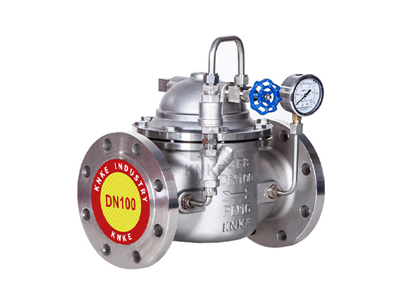 当阀门从阀前端给水时,水通过微型过滤器、针型阀、单向阀进入主阀控制室,再经过球阀排水至下游。因为针型阀开度小于球阀开度,即主阀控制室的排水速度大于进水速度,因此控制室压力降低,作用于主阀盘下端的阀前压力打开主阀向下游供水。当管道停止供水时,若下游水开始回流,一部分回流水经球阀进入主控制室,由于单向阀作用,回流水不能从主控制室流出,引起主控制室逐渐升压,缓缓关闭主阀。